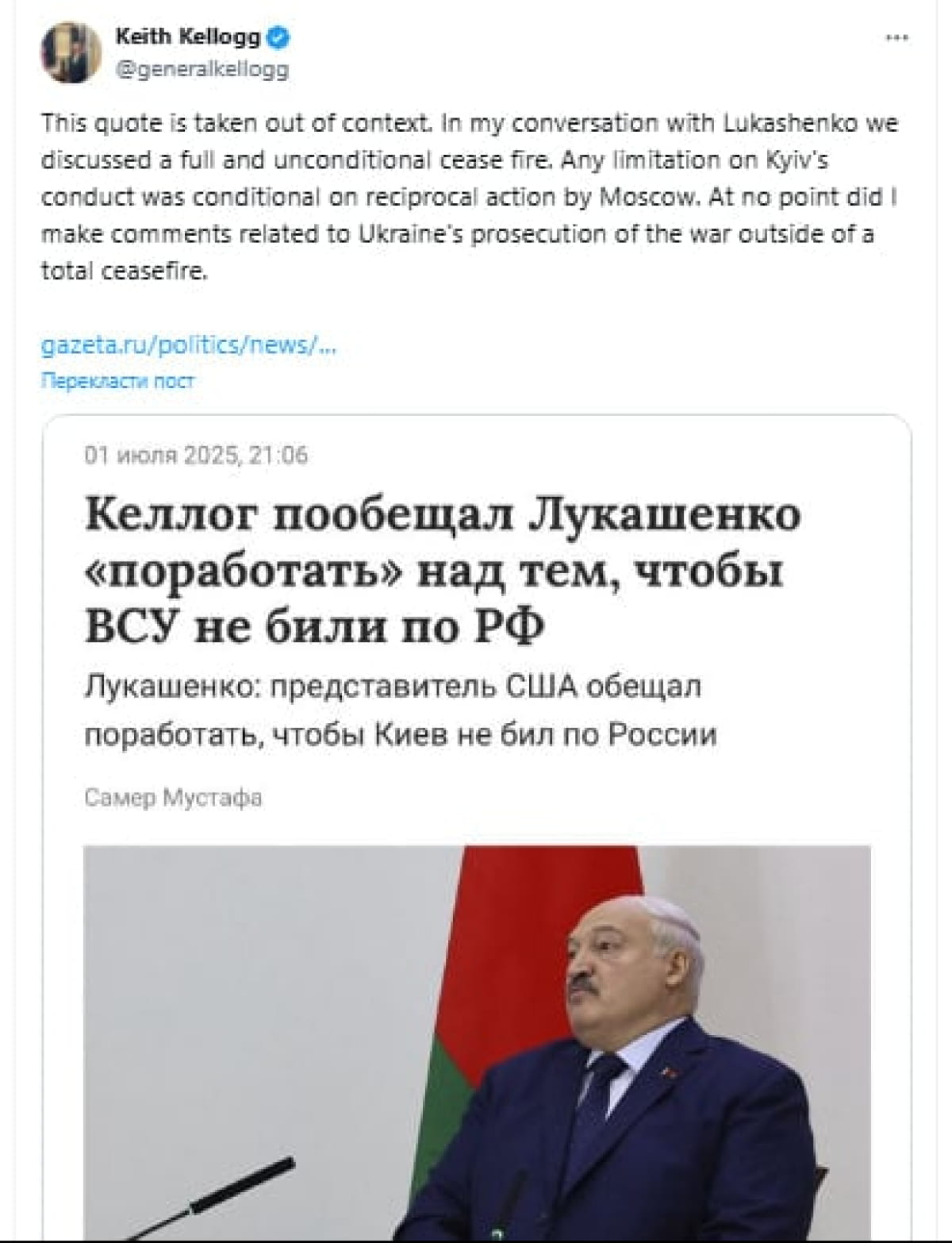 "Ця цитата вирвана з контексту. У моїй розмові з Лукашенком ми обговорювали повне та безумовне припинення вогню. Будь-яке обмеження поведінки Києва було обумовлене відповідними діями Москви. Я жодного разу не коментував продовження Україною війни поза межами повного припинення вогню", – зазначив він.