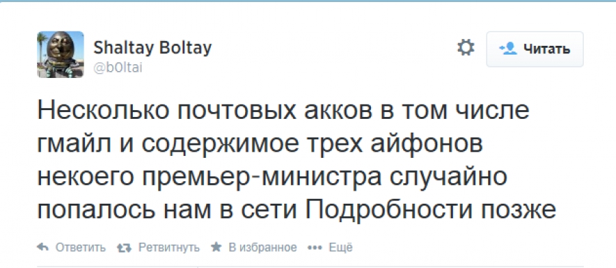 "Кілька поштових акков в тому числі гмайл і вміст трьох айфонів якогось прем'єр-міністра випадково попалося нам в мережі", - йдеться в повідомленні прес-секретаря групи "Шалтай-Болтай" в Twitter.