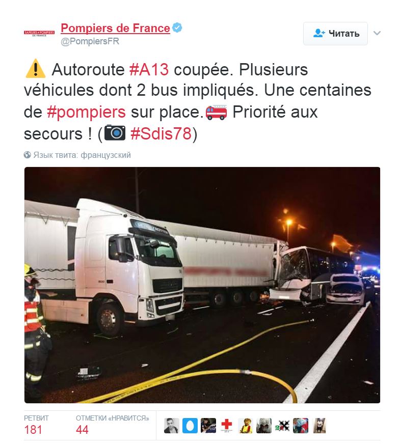 У Франції, неподалік Парижа сталася масштабна ДТП – на автомагістралі А13 зіткнулися два автобуси, вантажівка та чотири легкові автомобілі, повідомляє "5 канал".