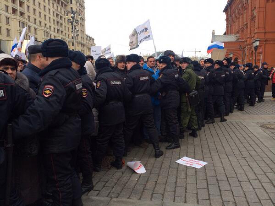 У учасників мітингу "георгієвські" прапори та прапори російських політичних партій, а також плакати з надписами "Крым с нами", "Крым с нами", "Чужого не надо, своего не отдадим", "Верим Путину!" та ін.