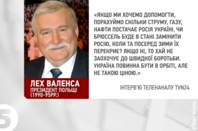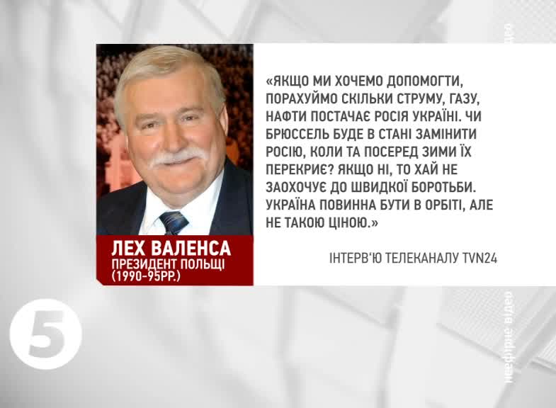 Лех Валенса, президент Польщі (1990-95 рр.): «Якщо ми хочемо допомогти, порахуймо скільки струму, газу, нафти постачає Росія Україні. Чи Брюссель буде в стані замінити Росію, коли та посеред зими їх перекриє? Якщо ні, то хай не заохочує до швидкої боротьби. Україна повинна бути в орбіті, але не такою ціною».