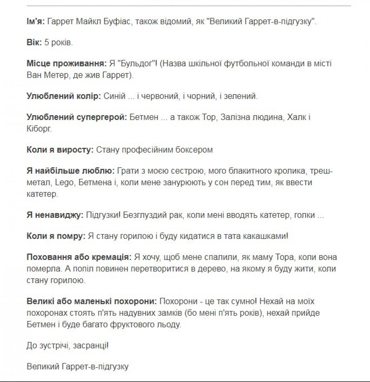 У Сполучених Штатах Америки 5-річний Гаррет Матіас надиктував батькам власний некролог – напередодні смерті. Хлопчик страждав від рідкісної форми раку. Про таке повідомляє "Укрінформ", посилаючись на видання Des Moines Register.