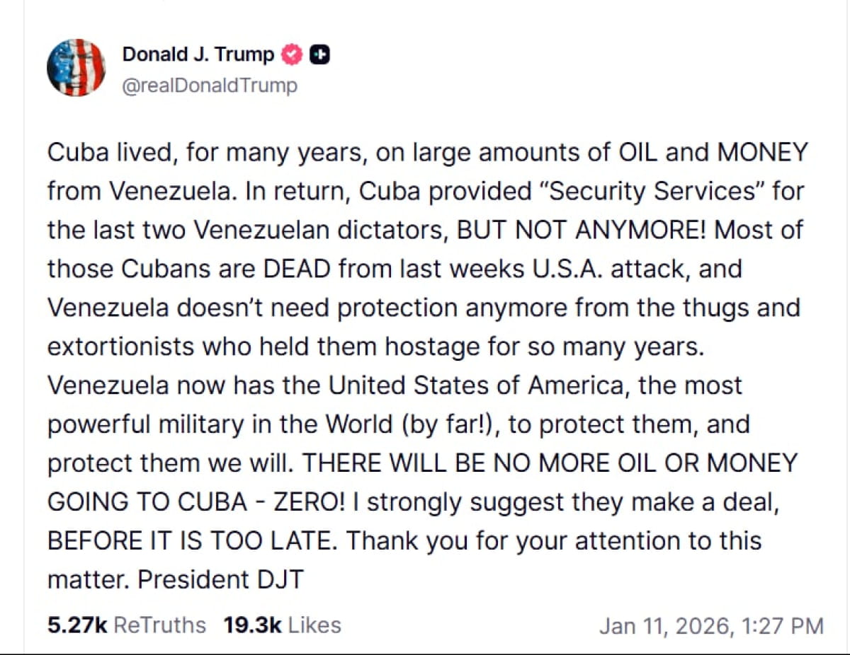 "Куба довгі роки жила за рахунок нафти та грошей з Венесуели. Натомість вона забезпечувала безпеку двом венесуельським диктаторам. Але цьому настав кінець. Більшість із цих кубинців мертві» у результаті операції США минулого тижня і Венесуела більше не потребує захисту від бандитів і здирників, які тримали її у заручниках протягом багатьох років Венесуела тепер має США найпотужнішу армію в світі (безумовно!) щоб захистити її і ми захистимо її", – написав Трамп.