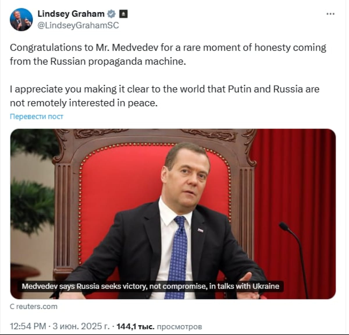 Сенатор-республіканець Ліндсі Грем назвав "рідкісним моментом чесності" пропагандистської машини РФ заяву Медведєва про те, що переговори у Стамбулі потрібні Москві не для миру.