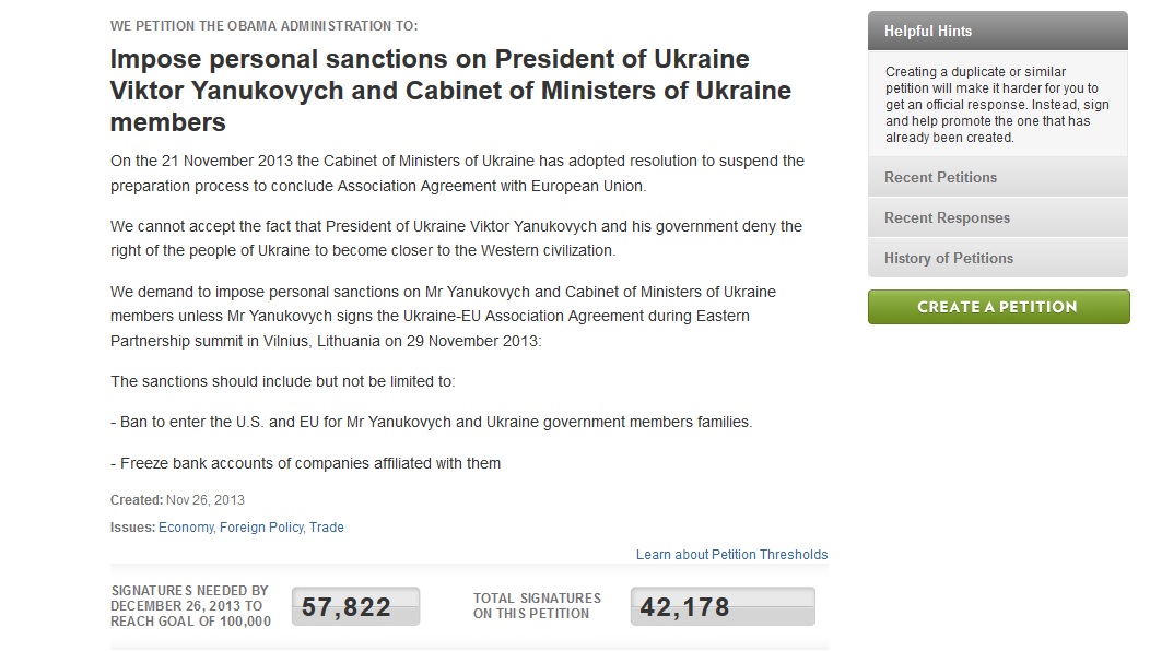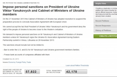 Документ з’явився на сайті Білого дому напередодні. Кількість автографів під ним зростає на кілька тисяч за годину. За задумом авторів документа, санкції передбачатимуть замороження закордонних рахунків названих посадовців та їхніх родичів, а також заборону в’їзду до США та ЄС. Щоби документ розглянула адміністрація США - слід зібрати 100 тисяч підписів протягом місяця. Підписати петицію може будь-хто. Для цього потрібно зареєструватися на сайті Білого дому, і підтвердити реєстрацію у своїй поштовій скринці.