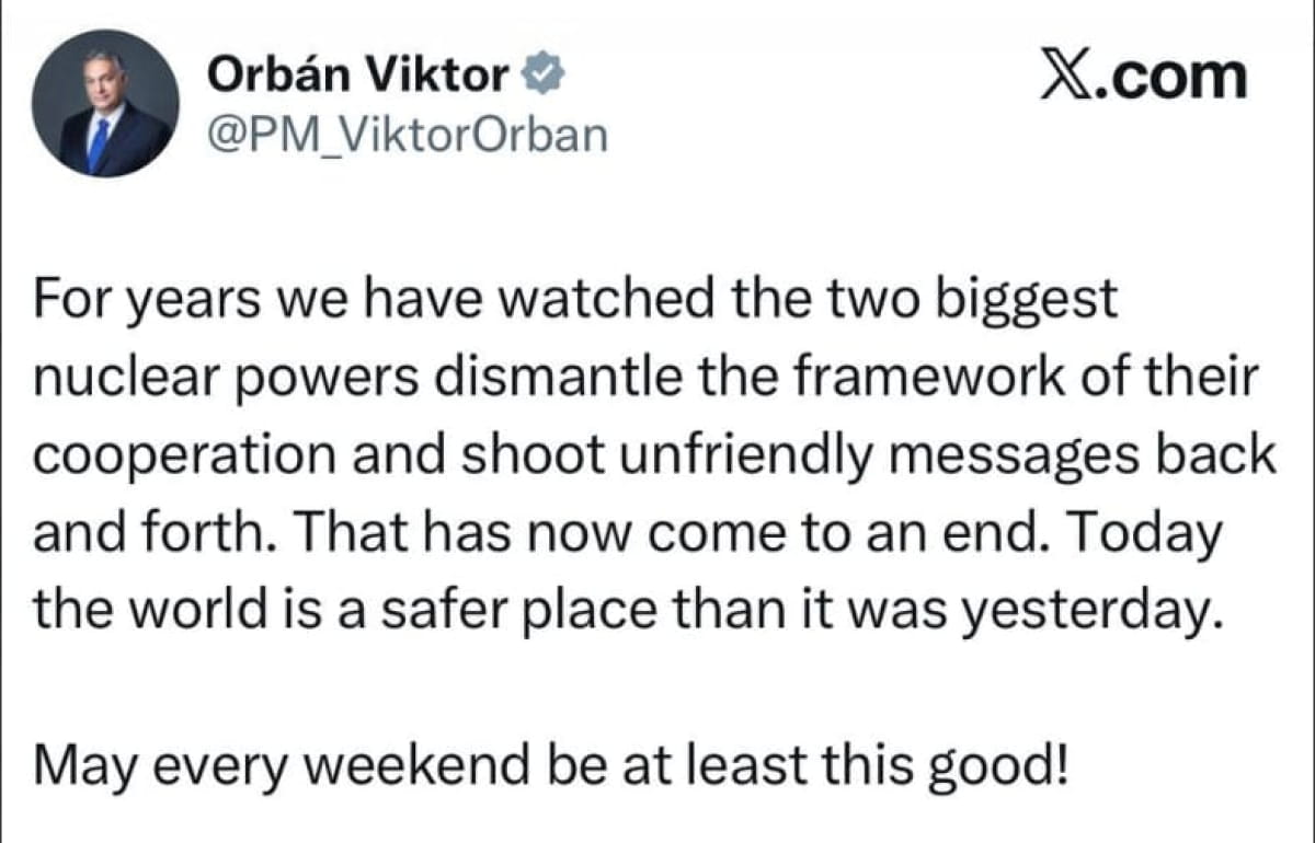 Прем'єр–міністр Угорщини Віктор Орбан прокоментував зустріч президента США Дональда Трампа та путіна, що минула на Алясці. Про це він написав на своїй сторінці в Х.