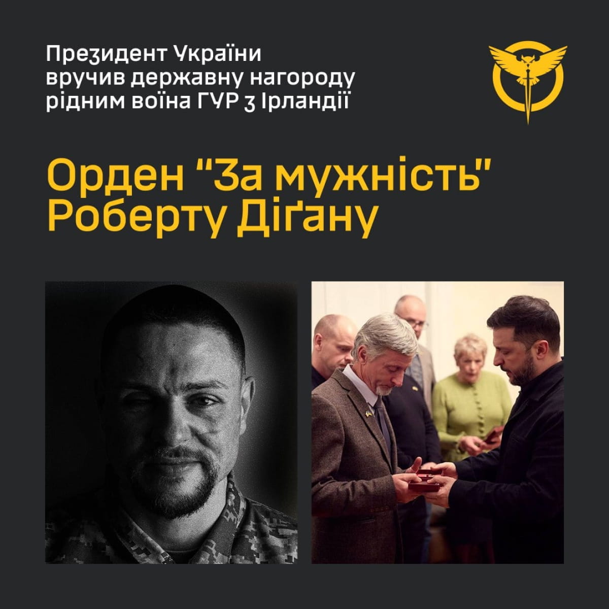 "2 грудня 2025 року в межах візиту до Ірландії Президент України Володимир Зеленський вручив Орден "За мужність" ІІІ ступеня рідним Роберта Діґана – воїна ГУР, який загинув за свободу в бою з російськими окупантами", – йдеться у дописі.