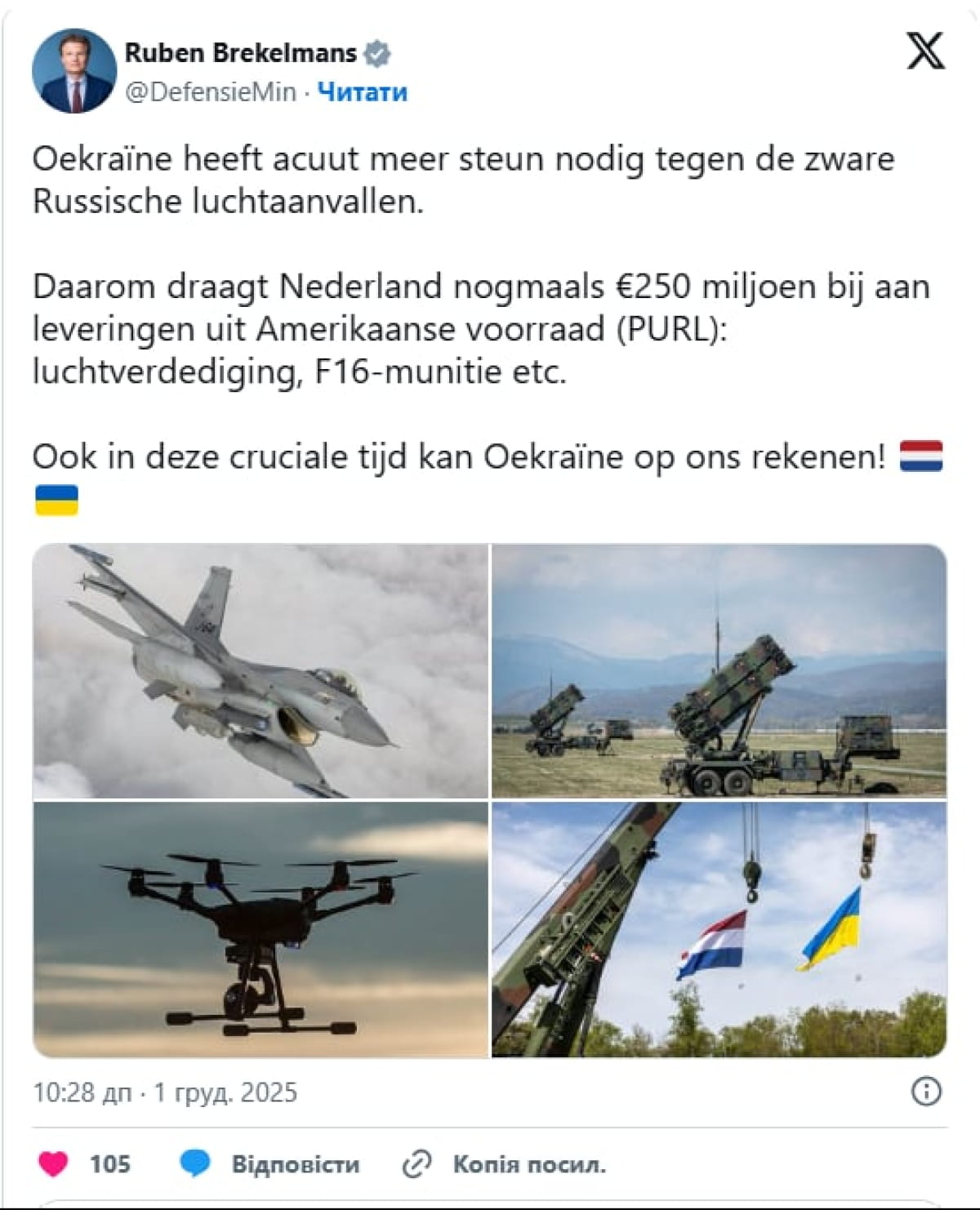 Нідерланди виділяють додаткові €250 мільйонів на закупівлю американської зброї для України за програмою PURL.
