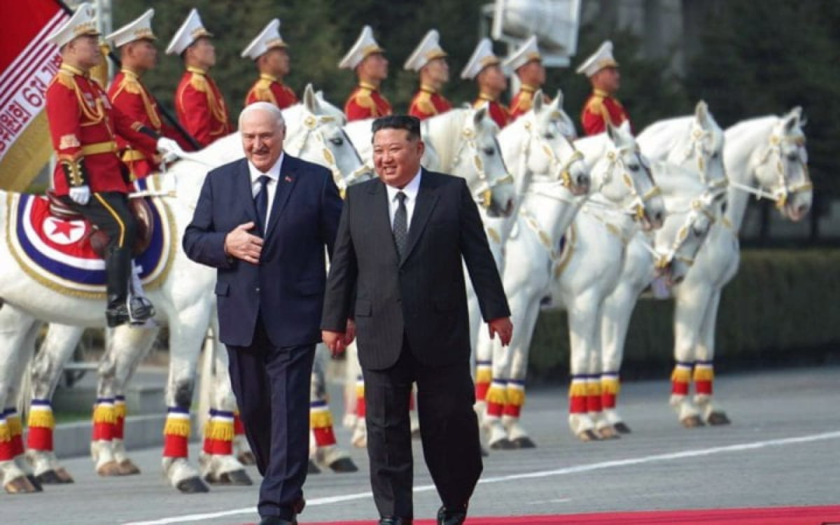 Повідомляється, що в Пхеньяні Лукашенка зустріли пишною церемонією: ряди солдатів і кавалерії, залп із 21 гармати та діти, які весело розмахували прапорами Білорусі та Північної Кореї.