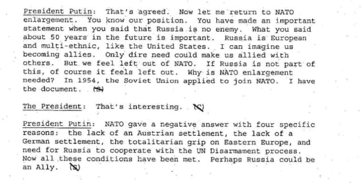 У розмові від 16 червня 2001 року путін нагадує про те, що СРСР колись просився у НАТО і ставить питання, чи можливо це зараз, коли озвучені у минулому причини відмови стали неактуальними.