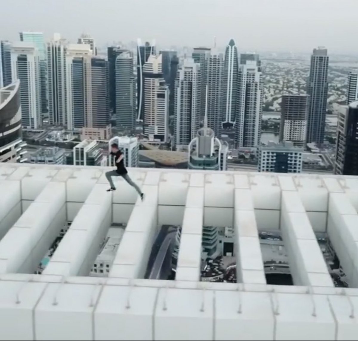 На відео Девід стоїть на краю 43-поверхової будівлі Dar Al Tower в Dubai Marina і без страховки на швидкості стрибає через бетонні опори на даху.