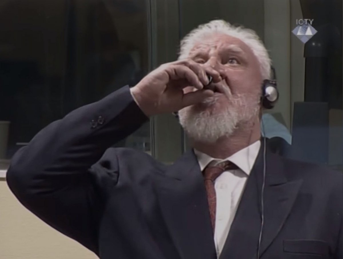 72-річний Слободан Праляк - колишній хорватський генерал, якого судили у Гаазі за воєнні злочини, зокрема за масові насильства та тортури. Міжнародний трибунал розглядав апеляцію на вирок Праляку і вирішив залишити його за ґратами. Після оголошення рішення чоловік дістав пляшку з отруйною рідиною і випив її. Засідання негайно призупинили, в зал викликали медиків. Однак екс-генерала врятувати не вдалося.