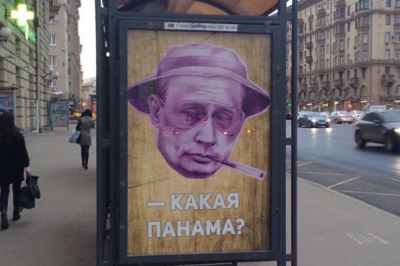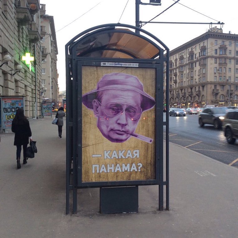 У Москві на Садовому кільці з’явився плакат із Путіним в образі відомого кіногероя-наркоторговця з фільму "Страх і ненависть у Лас-Вегасі", що натякає на зв’язок із панамськими офшорами. Відповідну фотографію у своєму Facebook розмістив журналіст Олег Кашин.
