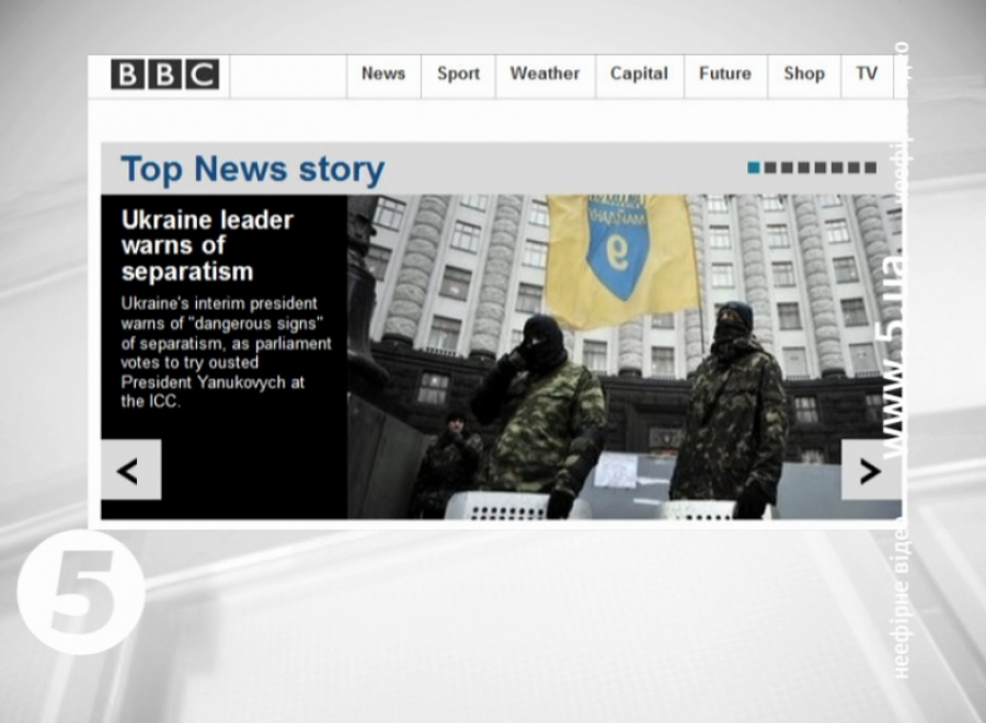 Український лідер попереджає про сепаратизм – під таким заголовком вийшла головна новина сайту британського суспільного мовлення Бі-Бі-Сі. В ній медіа розповідає про побоювання виконувача обов’язків президента України Олександра Турчинова щодо можливої спроби радикальних груп у Криму відділити півострів. Росія, наголошує Бі-Бі-Сі, хоча й негативно сприйняла зміну влади в Києві, пообіцяла у внутрішні справи України не втручатися.