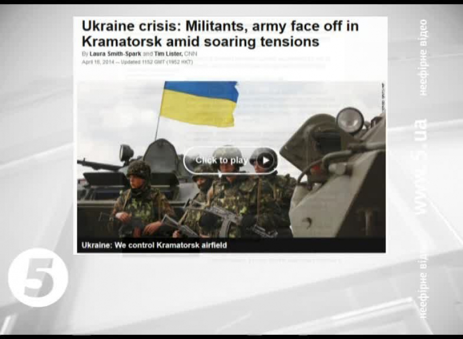 Про блокування українських солдатів у Краматорську розповідає в головній європейській новині британське суспільне мовлення ВВС. Його журналістка Ольга Івшина з місця подій повідомляє – колона бронетехніки ввійшла у місто у рамках антитерористичної операції, але її оточив натовп. Надійшли до неї й неперевірені повідомлення про перехід частини українських військових на бік сепаратистів. У Донецьку ж, за інформацією ВВС, невідомі озброєні бойовики без опору збоку місцевої міліції захопили офіс мера.