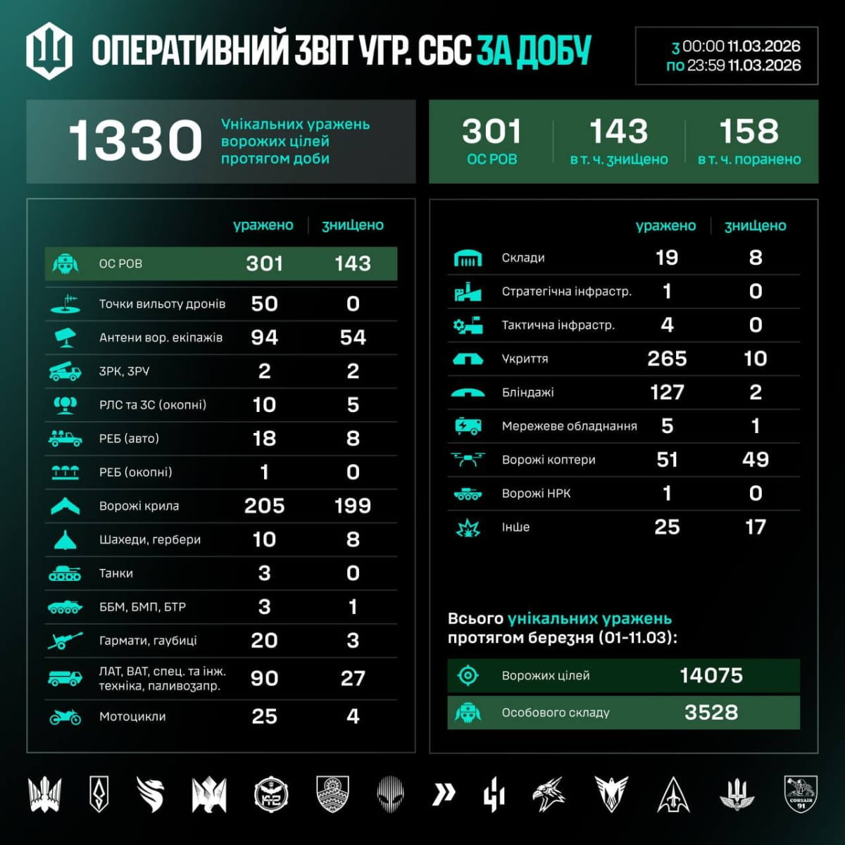 "Загалом упродовж березня (01–11.03) знищено/уражено 14075 цілей, з них – 3528 особовий склад противника", – йдеться в повідомленні СБС.