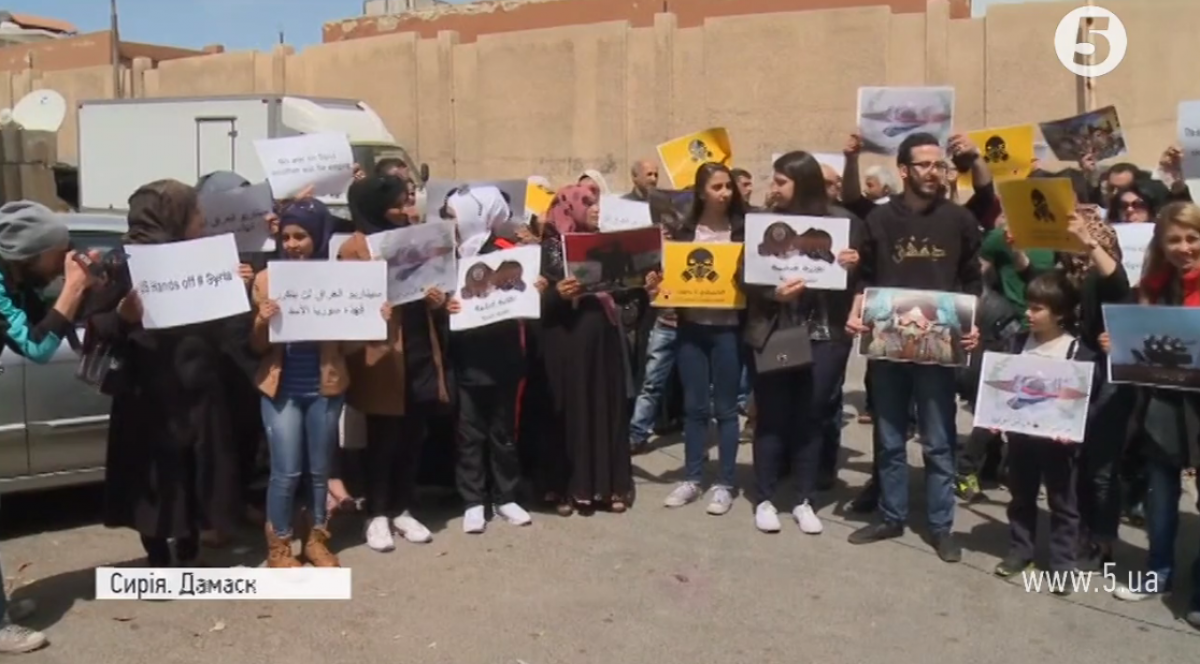 Люди вийшли на вулиці з плакатами "Руки геть від Сирії". Протестувальники побоюються, що їхню країну спіткає така сама доля, як і Ірак після вторгення міжнародної коаліції на чолі зі США 2003 року.