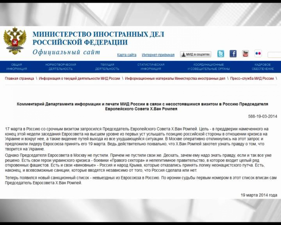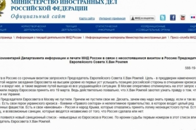 За даними місцевої преси, голова Європейської Ради мав сьогодні прилетіти до Москви, однак скасував свій візит напередодні. Згідно з версією МЗС Росії чиновник відмовився не з власної волі, голову Ради Європи "не пустили свої ж" - стверджують у Москві. У Міністерстві впевнені - перед засіданням Ради Європи, присвяченим Україні, Євросоюз не хоче чути думок Москви, які не збігаються з позицією Брюсселя.