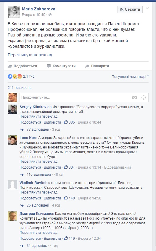 Нагадаємо, напередодні речниця МЗС Росії Марія Захарова відреагувала на убивство Павла Шеремета блюзнірською заявою про те, що "Україна перетворилась на кладовище журналістів". Цей випад викликав бурхливу реакцію у соцмережах, зокрема й у коментарях до повідомлення Захарової. Тим часом, радник голови МВС України уже заявив, що вбивство журналіста – це робота російських спецслужб.