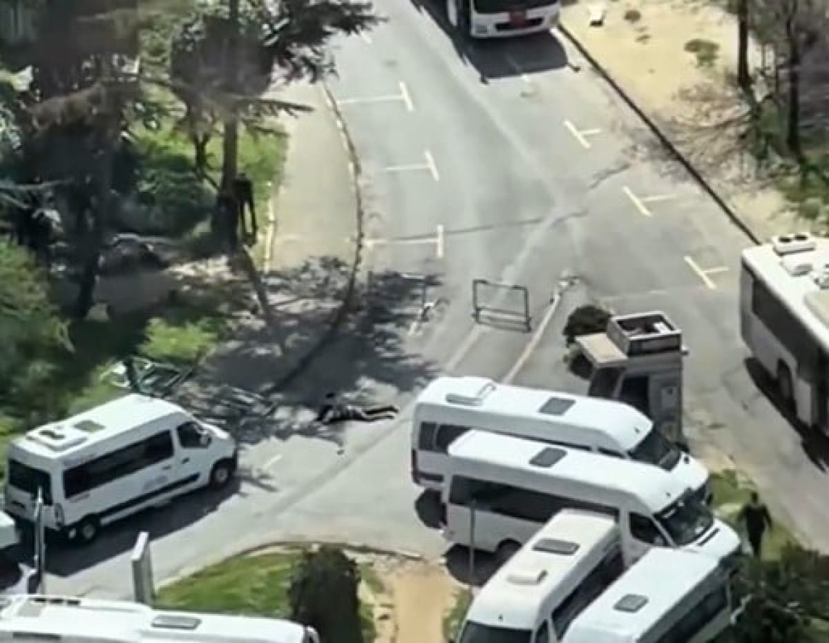 На відео з місця події видно, як один із нападників у темному одязі з рюкзаком пересувається між припаркованими службовими авто та відкриває вогонь з автоматичної гвинтівки та пістолета.