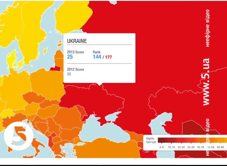 Усього у документі проаналізовано рівень корумпованості 177 країн світу. Своє 144-те місце Україна розділила з Іраном. Колишні радянські республіки – Білорусь, Росія та Казахстан – займають 123, 127 та 140 місця відповідно. А найбільші адвокати Євроінтеграції України – Швеція та Польща – опинилися на третьому та 38-му місцях. Найменш корумпованою країною визнали Данію, а найгірша ситуація з корупцією – в Північній Кореї, Афганістані та Сомалі.