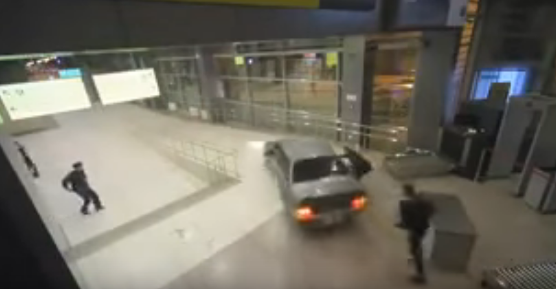 Спочатку він зніс шлагбаум, потім пробив стіну терміналу і в’їхав у приміщення. Автомобіль розбив кілька скляних дверей. Інцидент стався пізно ввечері, людей було небагато. Ніхто не постраждав. Служба охорони аеропорту намагалася зупинити автомобіль.