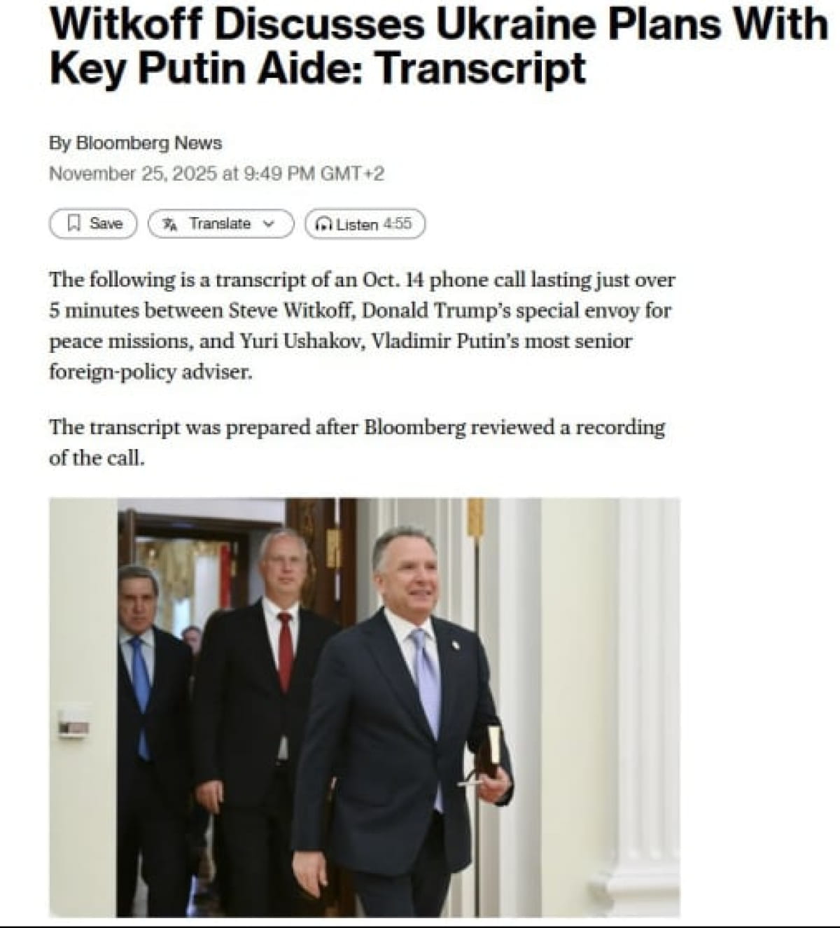 Видання опублікувало розшифровку між помічником путіна Ушаковим і російським посланцем Дмитрієвим. У телефонній розмові 14 жовтня Стів Віткофф дав Ушакову низку конкретних порад, як правильно підвести путіна до розмови з Трампом.