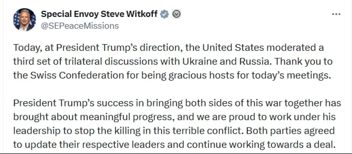За словами Віткоффа, 17 лютого за вказівкою президента Дональда Трампа США "виступили модератором третьої серії тристоронніх переговорів з Україною та росією". Також він висловив подяку Швейцарії за гостинність, після чого відзначив успіх Трампа у вирішенні "конфлікту".