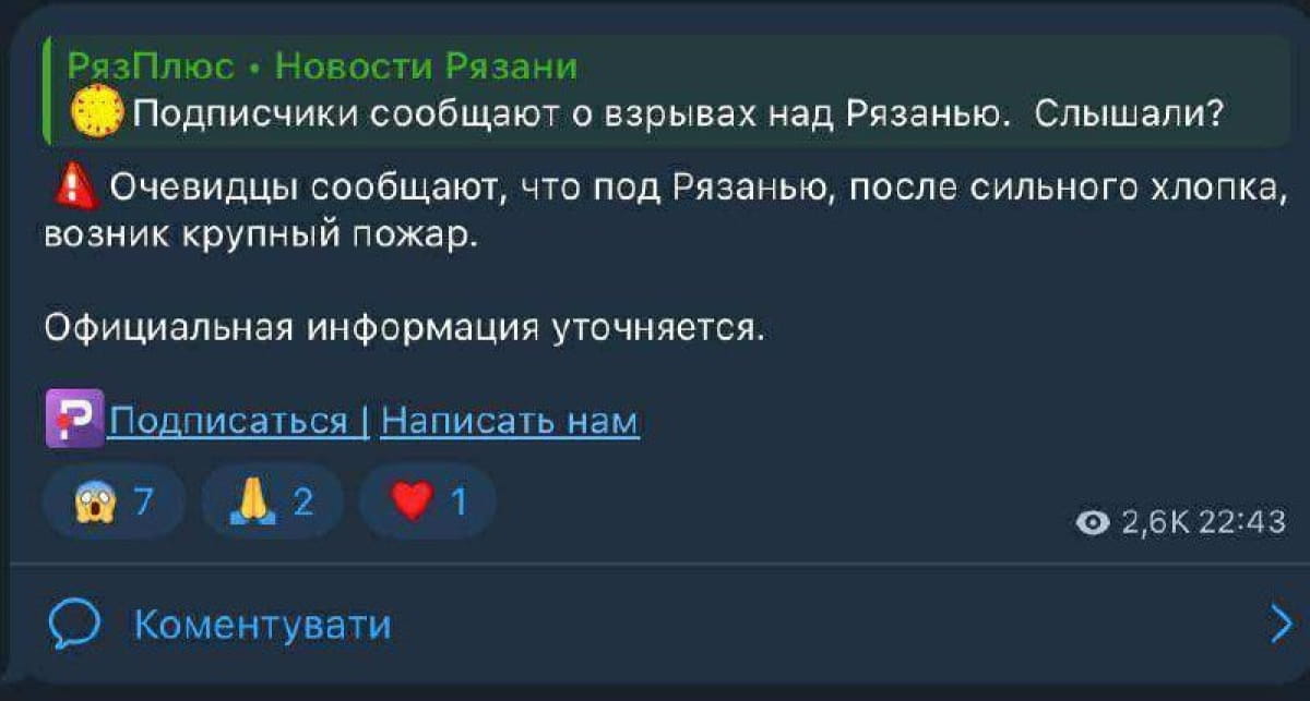 Вибух стався у районі села Божатково поблизу Рязані. На місці працюють правоохоронні органи та ремонтні бригади, які намагаються усунути наслідки.