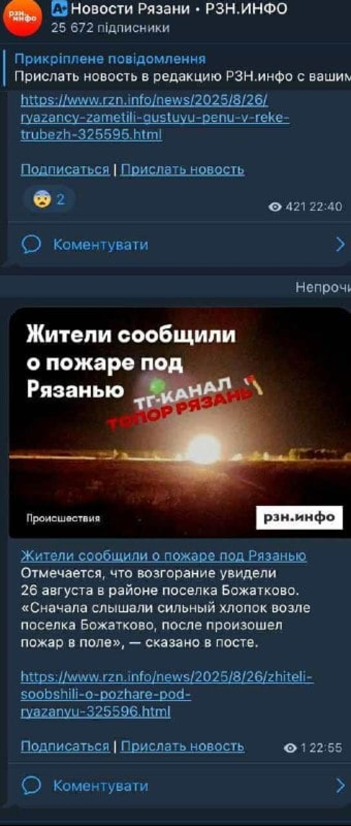 Учора, 26 серпня, в Рязанській області росії стався потужний вибух на магістральному нафтопроводі "Рязань – Москва". Ця труба є одним із головних джерел постачання нафтопродуктів до столиці держави-агресорки. Про це повідомляє "24 канал", hromadske та NV із посиланням на ГУР.