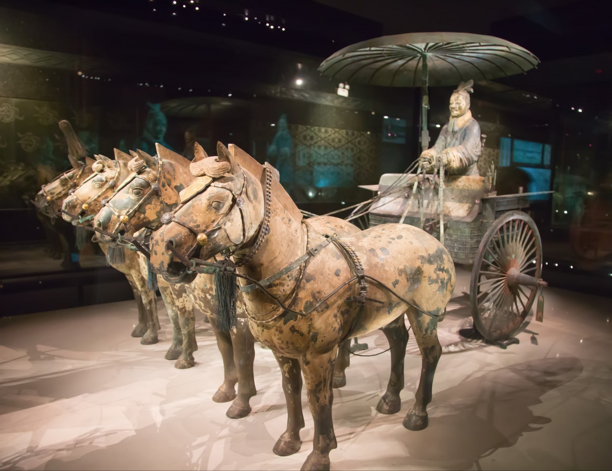 - Разом із солдатами стоять теракотові військові колісниці і запряжені коні. До слова, вага одного коня – близько 200 кг. У кожного воїна була при собі справжня зброя: списи, щити, луки, арбалети і мечі. Вражає те, що зброя навіть за 2200 років залишилася гострою.