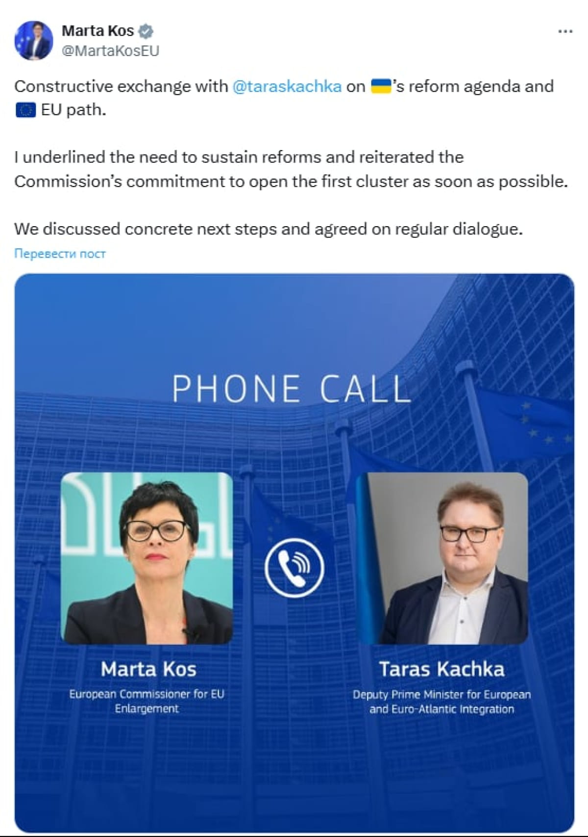 Єврокомісарка також додала, що обговорила з Качкою конкретні наступні кроки та домовилась із ним про регулярний діалог.