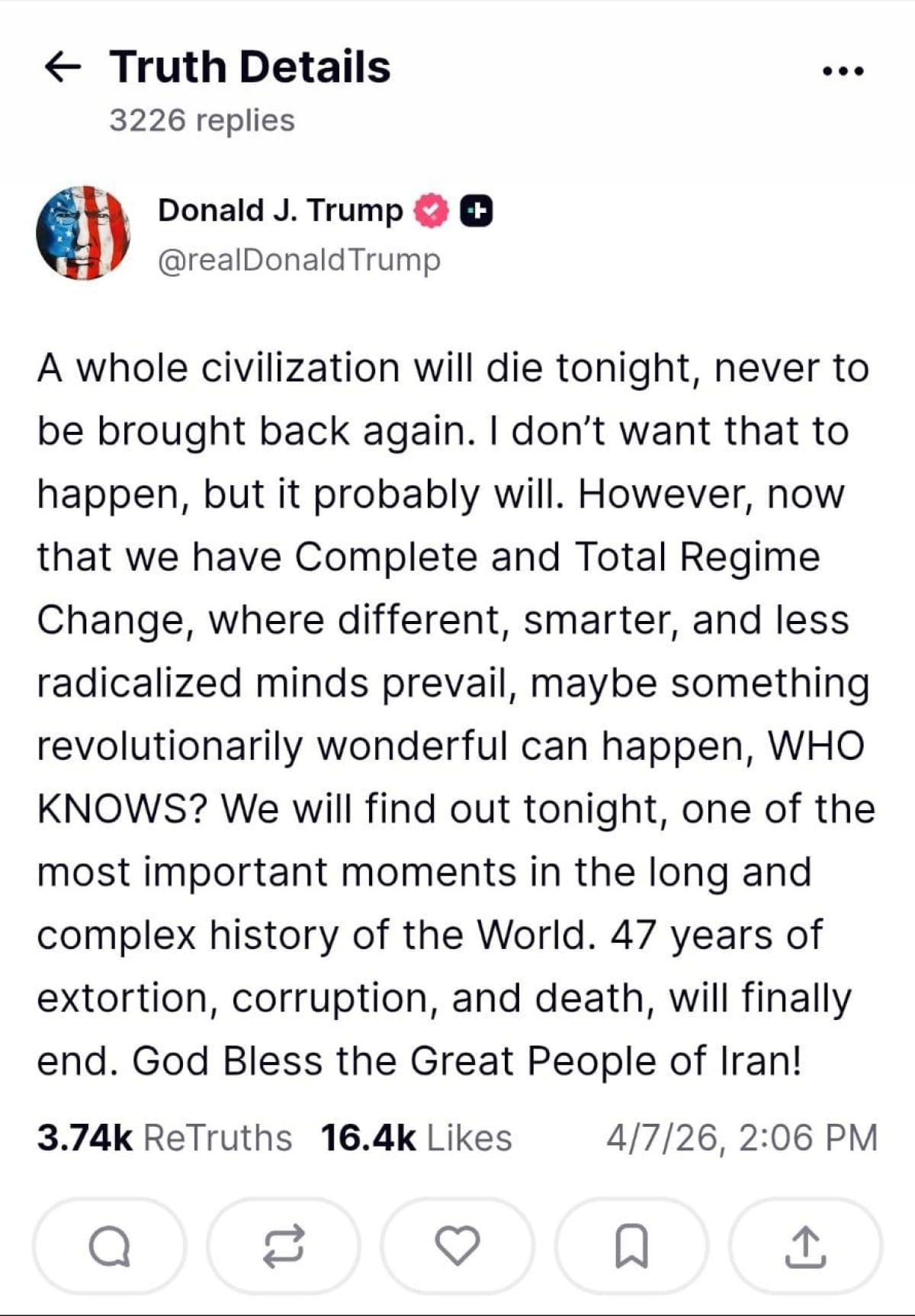 "Сьогодні вночі загине ціла цивілізація, і її вже ніколи не повернути. Я не хочу, щоб це сталося, але, ймовірно, так і буде", – написав Трамп.