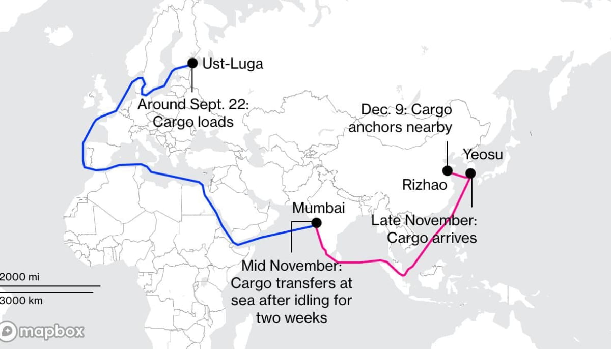 "Подорож вантажу розпочалася на іншому судні – танкері Ailana, який наприкінці вересня отримав близько 720 тис. барелів із російського танкера в Усть-Лузі на Балтійському морі. Далі судно пройшло Середземне море, Суецький канал і прибуло до Мумбаї, де майже на два тижні зупинилося", – наголошує інформагентство.