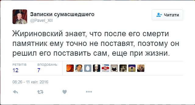 "Ніколи не думав про скульптуру на мою честь. А наразі 11 квітня запам'ятається людству цією церемонією. Так, люди хочуть свята!" - заявив сам Жириновський.