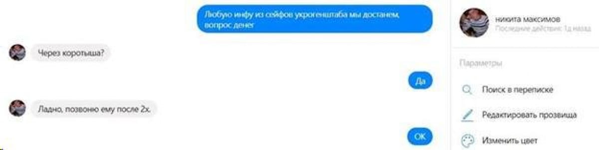 "Скрін листування Коротких з Усовським (ФСБ-шник, що займався організацією антиукраїнських акцій у Східній Європі). Коротких пише Усовському, який вмовляє чинити Третій Майдан: "Я [Коротких] зараз здебільшого в районі Бессарабії контрабанду ганяю. Тому краще тобі [Усовський] в Одесу [приїхати]. Там є пансіонат "Немо". Влаштую тобі щоранку заплив з дельфінами", – жартують чоловіки.