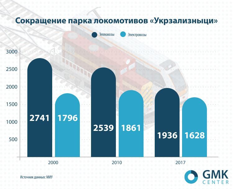"За різними джерелами, станом на 2018 рік в інвентарному парку "Укрзалізниці" значилося 1758 локомотивів, з них в експлуатації знаходилося тільки 945. Крім того, за 10 місяців 2018 року УЗ виконала лише 50,8% річного плану з ремонту локомотивів: відремонтувала 95 машин, замість 187", — пише експерт.