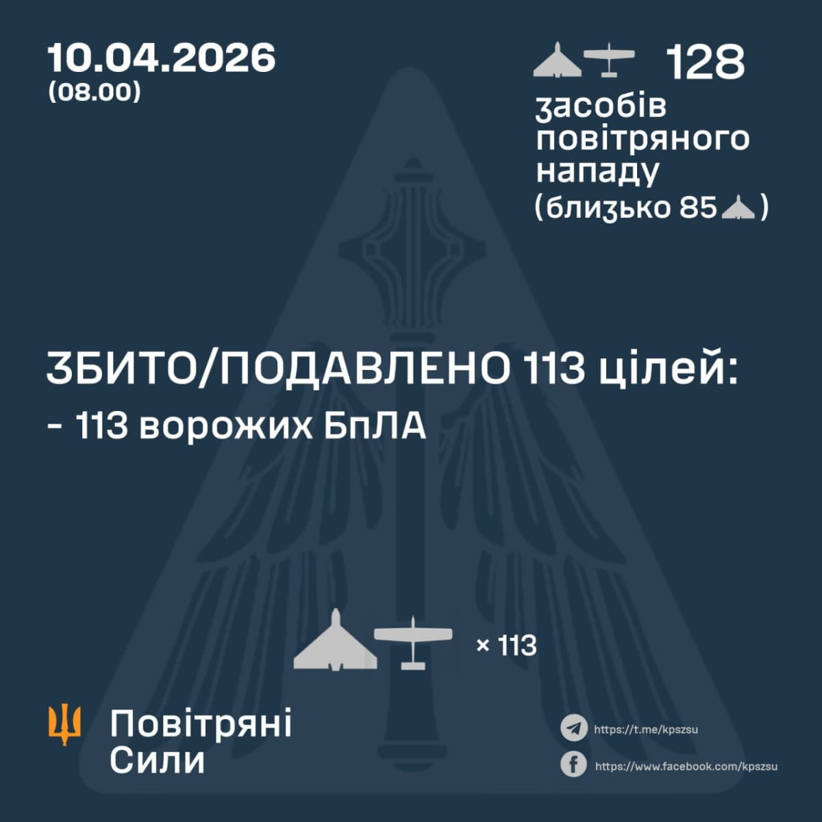У ніч на 10 квітня противник атакував Україну 128 ударними БпЛА типу Shahed, Гербера, Італмас та безпілотниками інших типів із напрямків: Орел, Міллєрово, Приморсько-Ахтарськ – рф., Гвардійське, Чауда – ТОТ АР Крим, близько 85 із них – "шахеди". Про це повідомляють Повітряні сили.