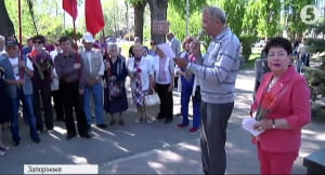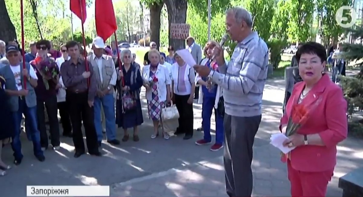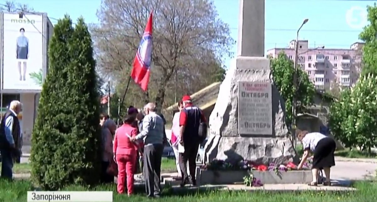 Нетривалим був першотравневий мітинг і у Запоріжжі. Там, біля недекомунізованого пам'ятника на честь Жовтневого перевороту зібралися близько сотні учасників. Більшість – пенсіонери. Мітингарі проявили кмітливість. Щоб не порушувати закон про декомунізацію, на мітинг взяли червоні прапори без символіки й вбралися у червоні сукні та сорочки. Учасники покладали квіти до пам'ятника, декламували вірші і за півгодини розійшлися