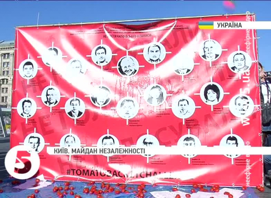 На Майдані Незалежності метали гнилі томати у портрети тих народних обранців, які 16-го вересня не голосували за створення Антикорупційного бюро. Під томатний обстріл потрапили двадцять чотири нардепи, які не бажають протидіяти корупції. Дев'ятнадцять з них і тепер балотуються до Верховної Ради, причому це як колишні регіонали, так і кандидати від Блоку Петра Порошенка, "Народного фронту" і "Батьківщини". П'ятдесят кілограмів помідорів мають отямити депутатів – вирішили активісти, і дали їм шанс виправитися і таки проголосувати за антикорупційний законопроект 7-го жовтня, коли парламент збереться на позачергове засідання,
