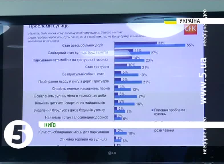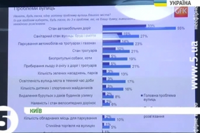 Найбільшим лихом міські дороги назвала третина опитаних. Містян також непокоїть сміття на вулицях, припарковані на газонах та тротуарах автомобілі, а також відсутність самих парковок. До рейтингу також потрапили стан тротуарів, безпритульні тварини та неналежне прибирання вулиць узимку. Найменше киян турбує зовнішня реклама та стихійна торгівля. За результатами опитування громадська рада, створена при КМДА, обіцяє підготувати низку звернень до чиновників.