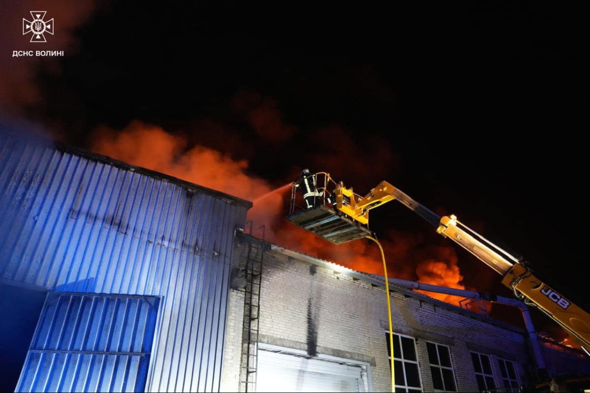 На Волині внаслідок атаки загорілося підприємство. Площа займання становила понад 1000 квадратних метрів. Пожежу гасили декілька годин, її вдалося ліквідувати.