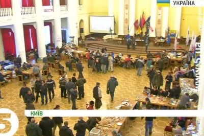 Частина меблів у колонній залі вже розтрощена, стіни розмальовані фарбою та обклеєні інформаційними плакатам. На першому ж поверсі ситуація не краща. Там вибиті вікна та вхідні двері, а також купи торб зі сміттям, яке не прибирається. Всі входи та виходи забарикадовані розтрощеними частинами комунального майна. Страйкарі, натомість, запевняють – роботі чиновників не заважають, оскільки займають лише два перших поверхи, і закликають їх повертатись до виконання службових обов'язків.