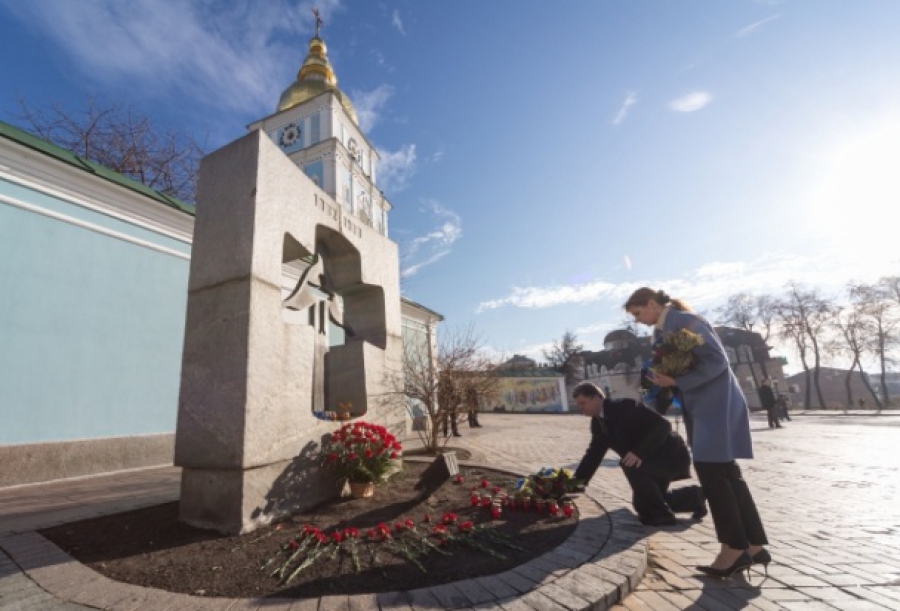 Вони поклали квіти до меморіалу біля Михайлівського Золотоверхого собору в Києві. Голова держави поспілкувався з людьми, що в цей час були на Михайлівській площі.
