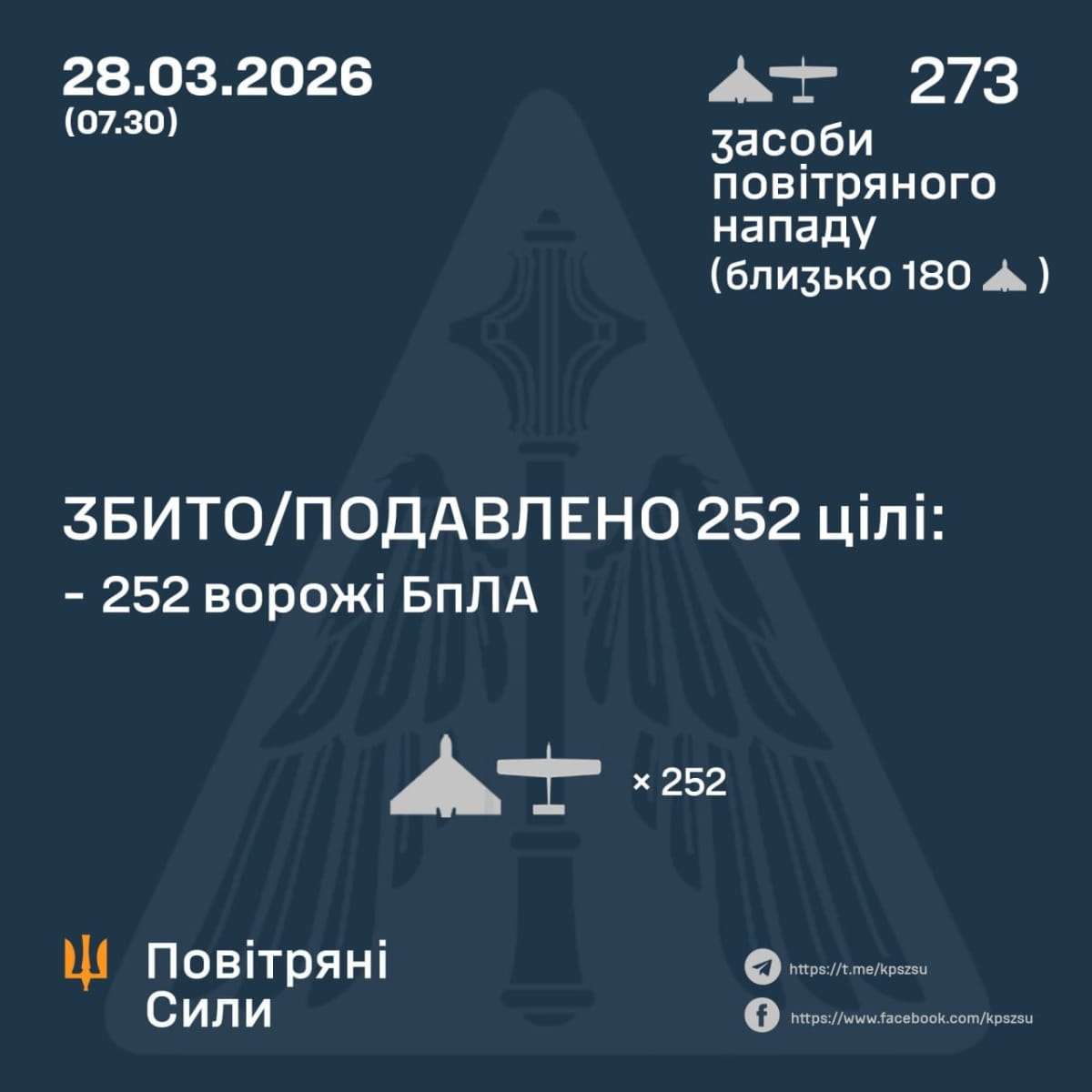 У ніч на 28 березня противник атакував Україну 273 ударними БпЛА типу Shahed, Гербера, Італмас та безпілотниками інших типів. Про це повідомляють Повітряні сили.
