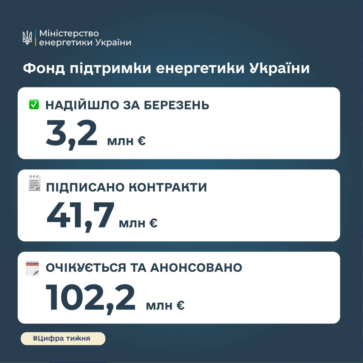 "У березні до Фонду підтримки енергетики України надійшли грантові внески від Ісландії та Словенії. Загальний обсяг надходжень становить 3,2 млн євро", – йдеться у дописі.